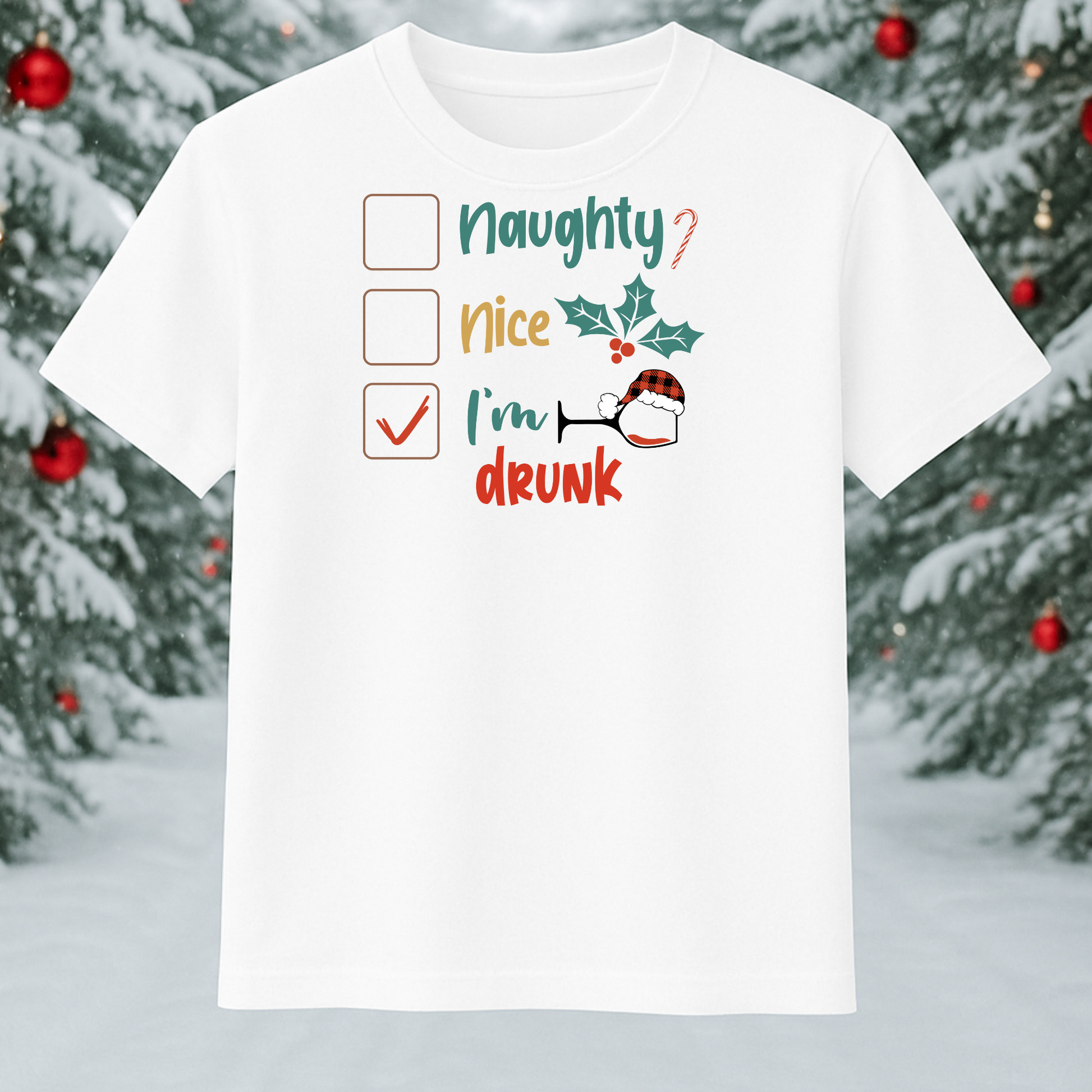 Get ready for some holiday fun with the I'm Drunk Christmas List! This playful checklist comes with three options: "Naughty?", "Nice", and the checked box for "I'm drunk". Printed in festive fonts and accompanied by festive illustrations, this checklist is perfect for adding some laughter to your holiday celebrations. Available in a variety of colors and apparel.