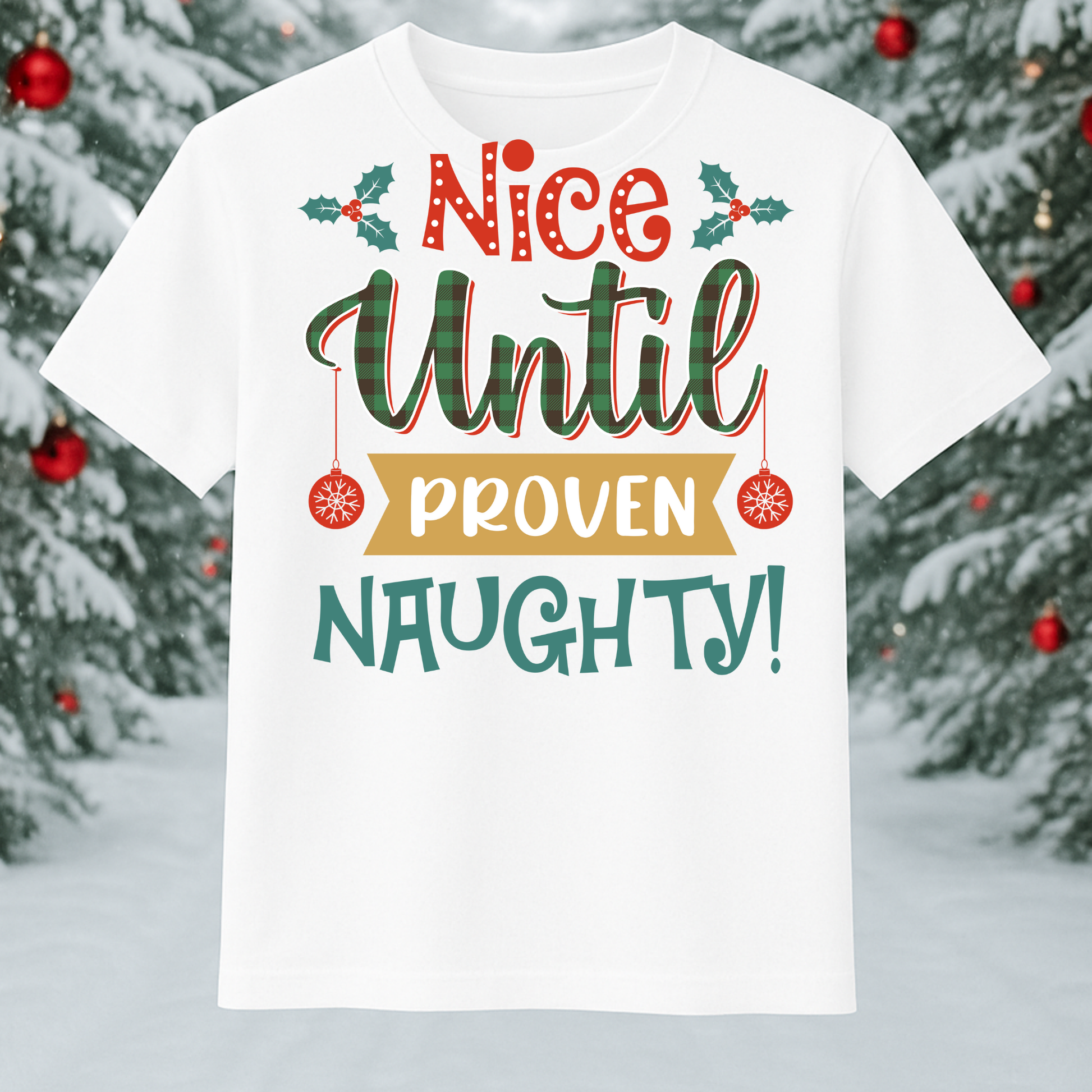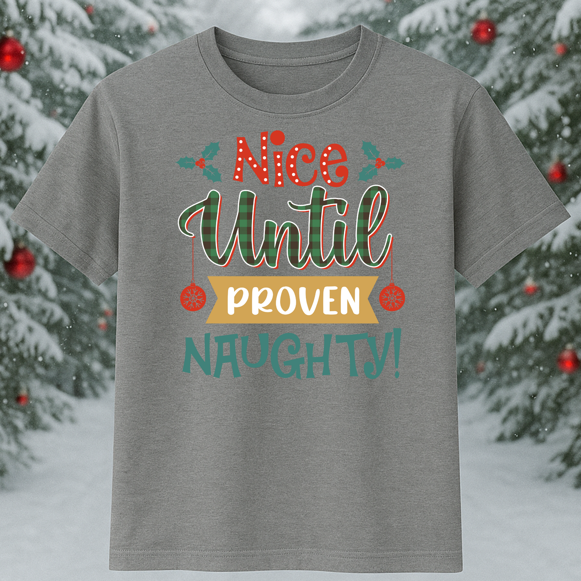 Experience classic Christmas charm with a playful twist in "Nice Until Proven Naughty". The bold red lettering with white polka dots radiates cheerful vibes, while the flowing script in green plaid adds a cozy touch. The all-caps teal font adds a punch of humor to the message, perfect for holiday apparel and gifting. Available in a variety of colors and styles.
